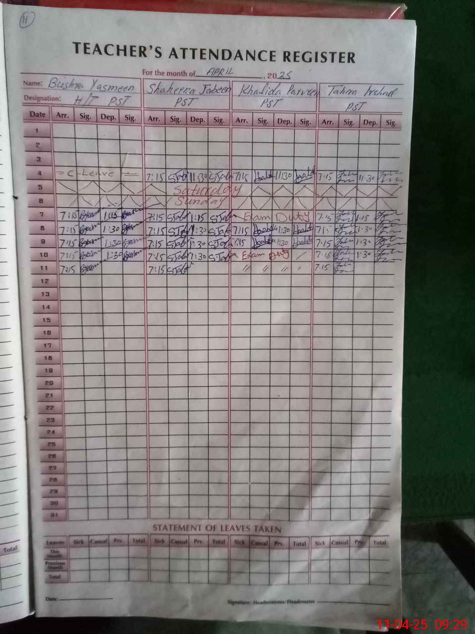 | 31**** | Kh**** Pa**** | PST | Regular | 0 | 11 | 0 | 0 | 0 | 0 | 0 | 0 | 0 | Exam Duty |