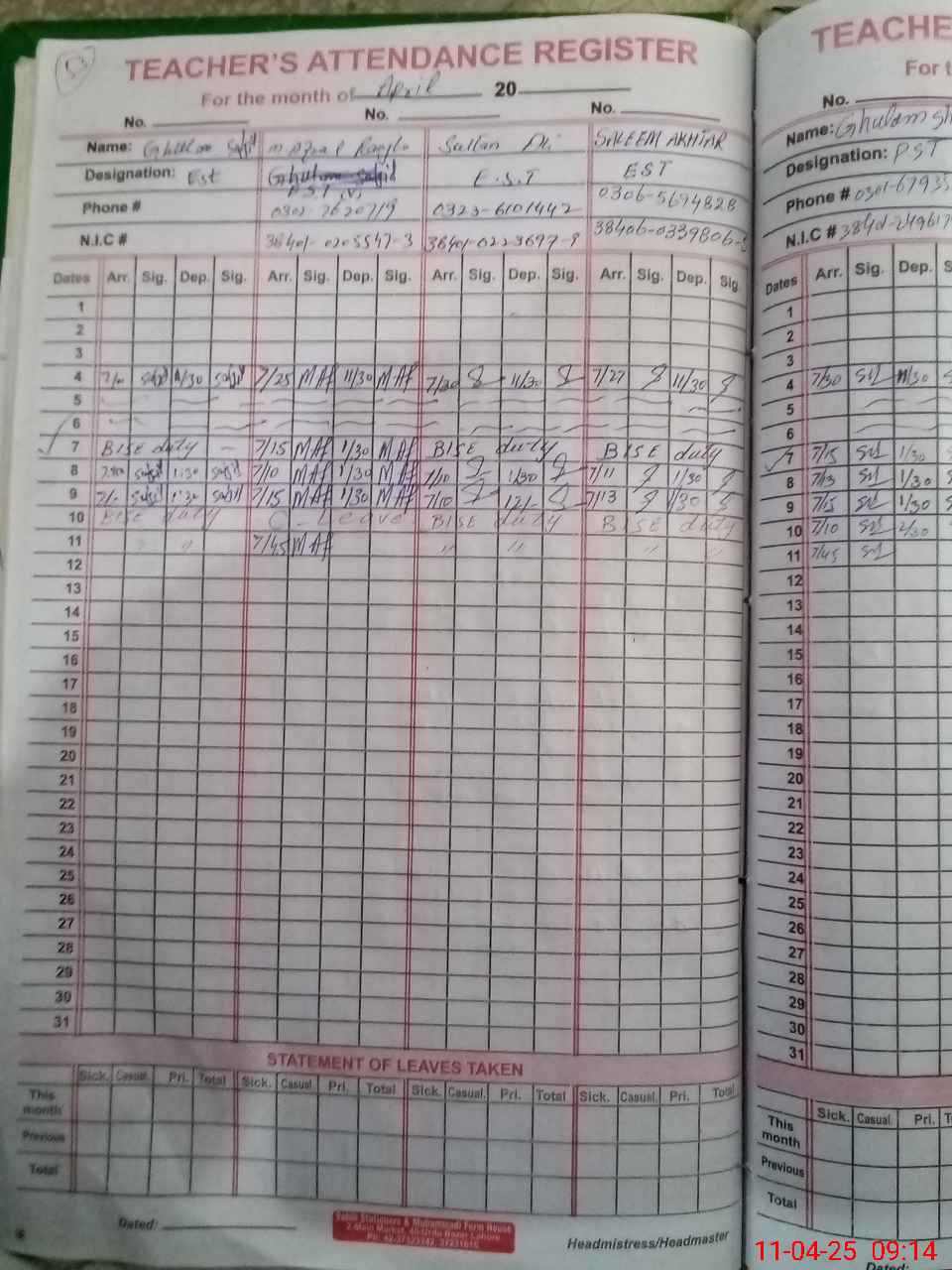 | CNIC | Full Name | Designation | R/C | Absence During Last Calender Month |