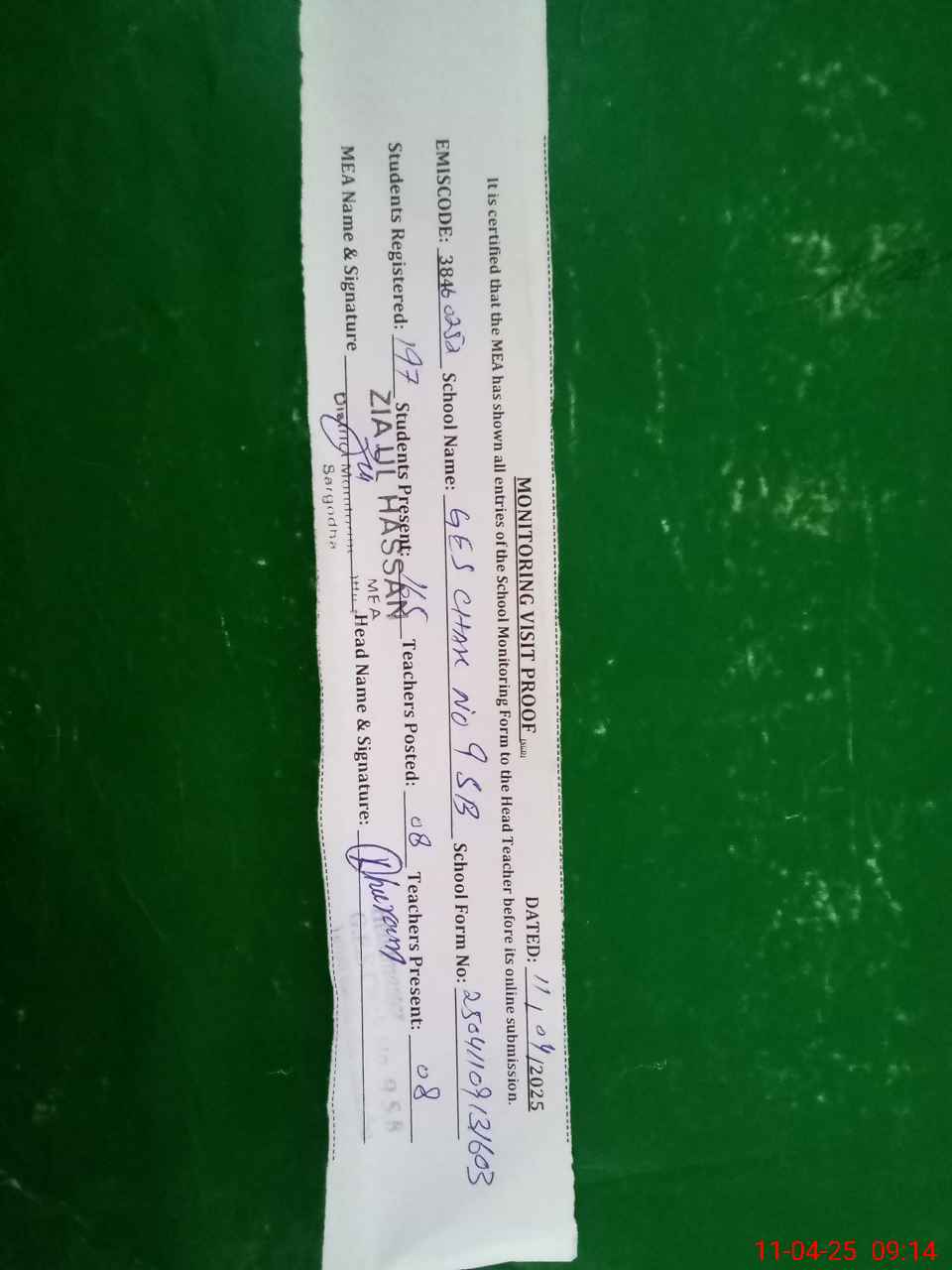 | Monitoring Date: 11-04-2025 | Start Time: 11-04-2025 08:30 AM | End Time: 11-04-2025 09:15 AM | Name of MEA: ZI**** ULHA**** | |