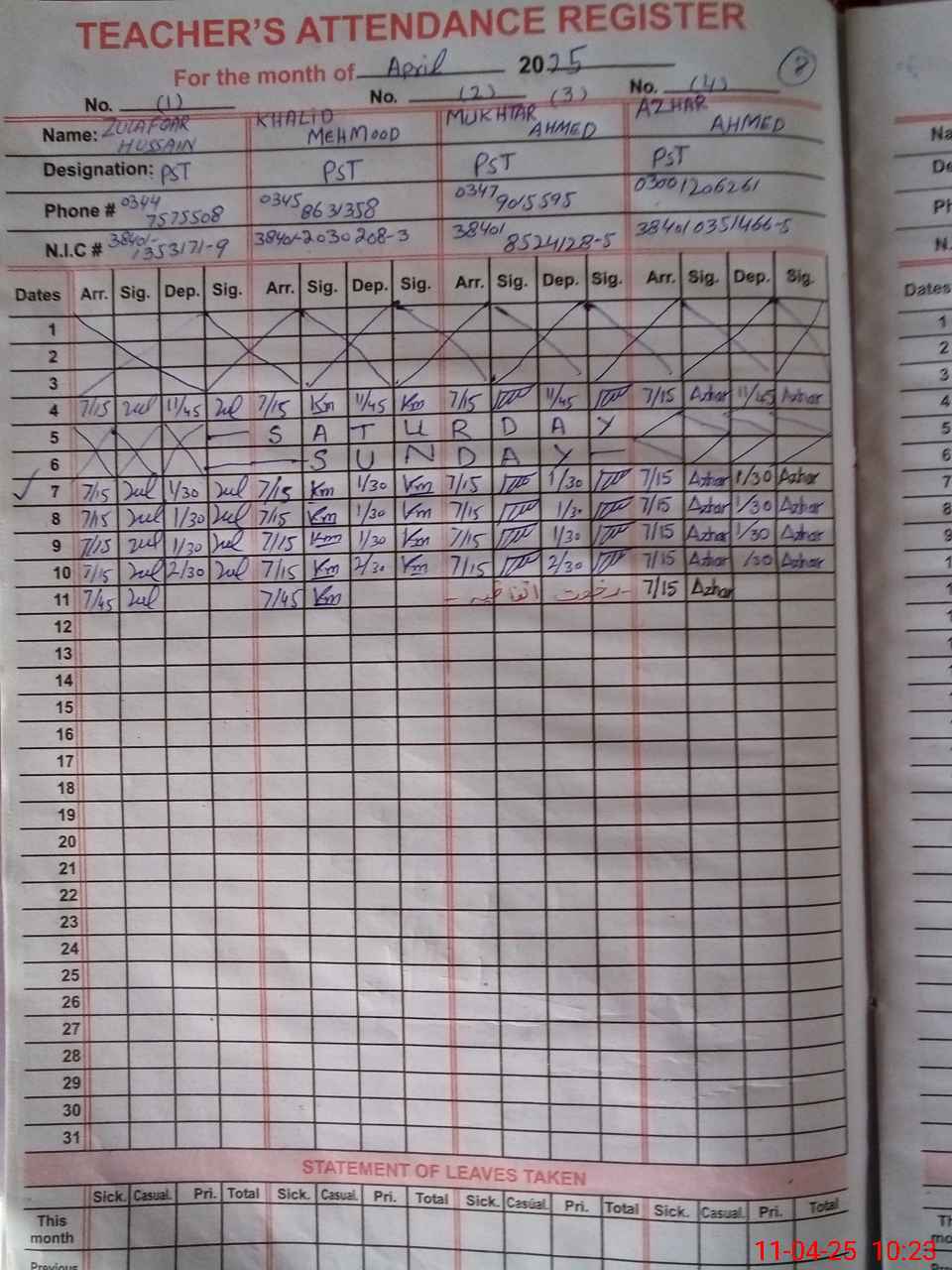 | Name: ZU**** HU**** Designation: (School Headmaster's/Headmistress's) PST Phone/Cell Number: 03**** |