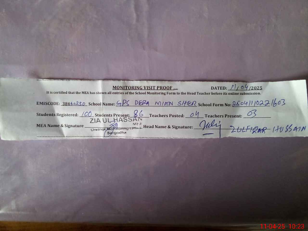 | Monitoring Date: 11-04-2025 | Start Time: 11-04-2025 09:55 AM | End Time: 11-04-2025 10:24 AM | Name of MEA: ZI**** ULHA**** | |