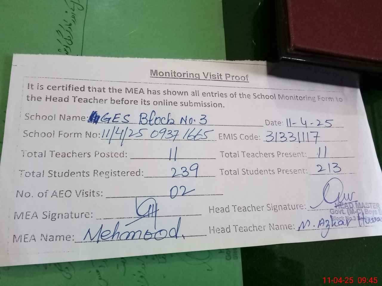 | Attendance Register | Head Teacher | MEA with School | Visit Proof |