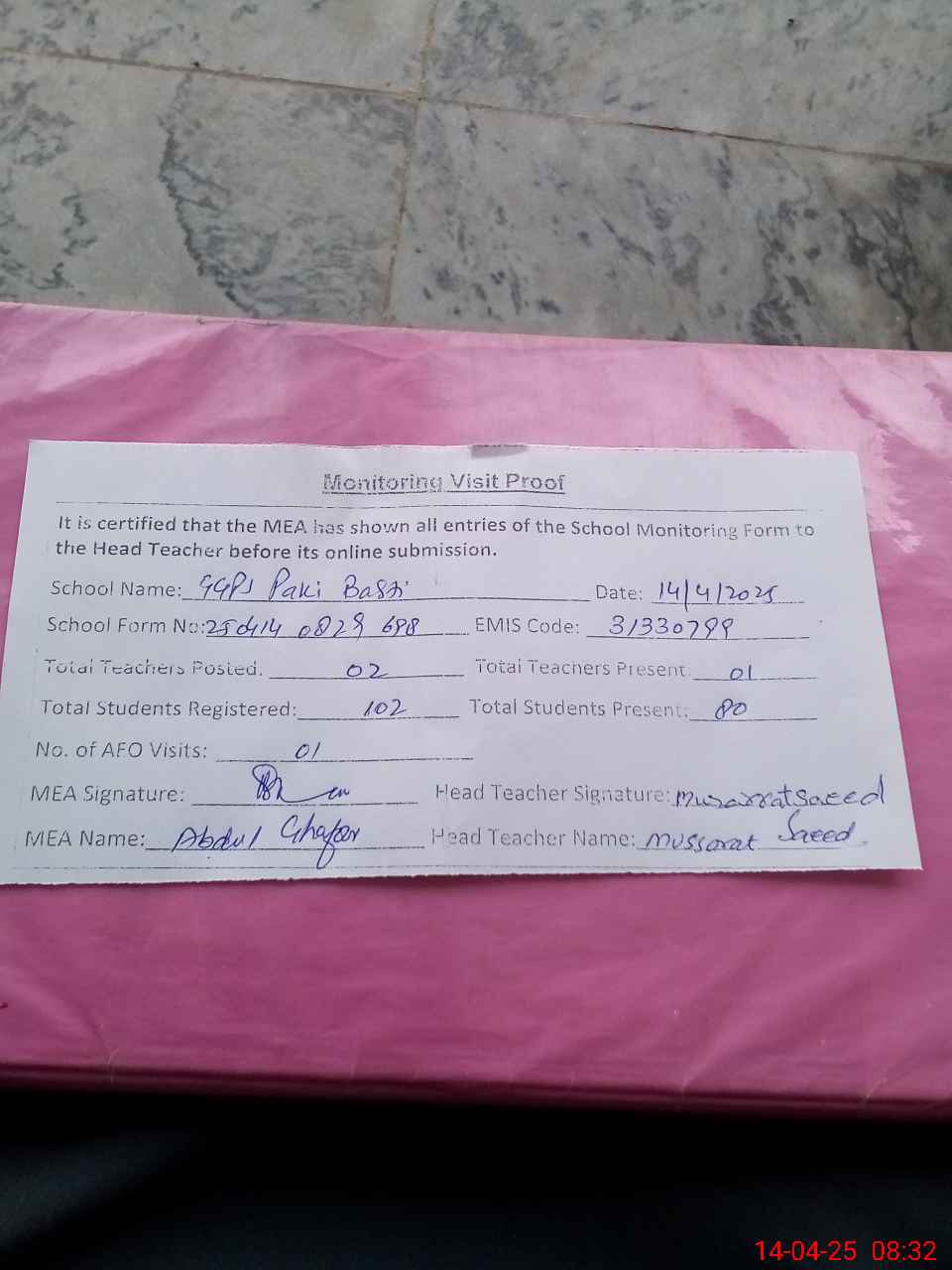 | Attendance Register | Head Teacher | MEA with School | Visit Proof |