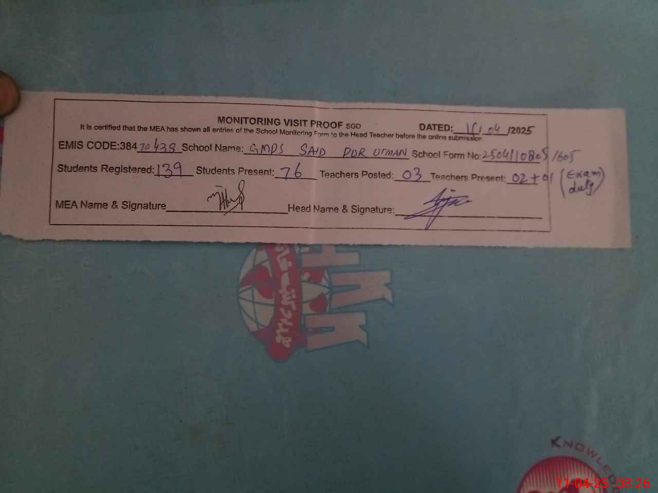 | EMIS Code: 38470438 | Name of School: GMPS SAID PUR UTMAN | |||