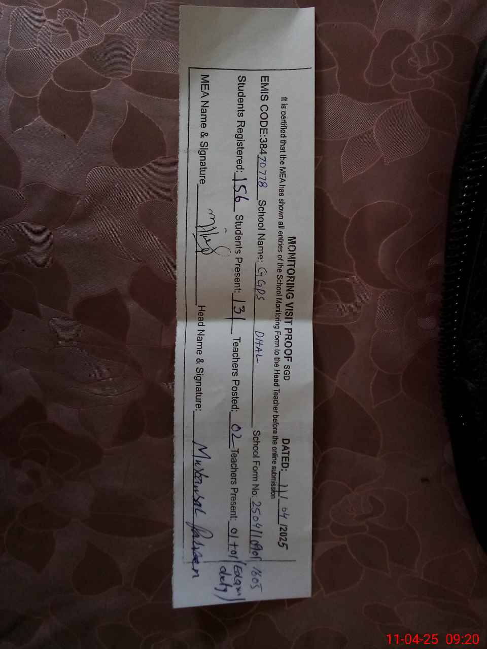 | Attendance Register | Head Teacher | MEA with School | Visit Proof |