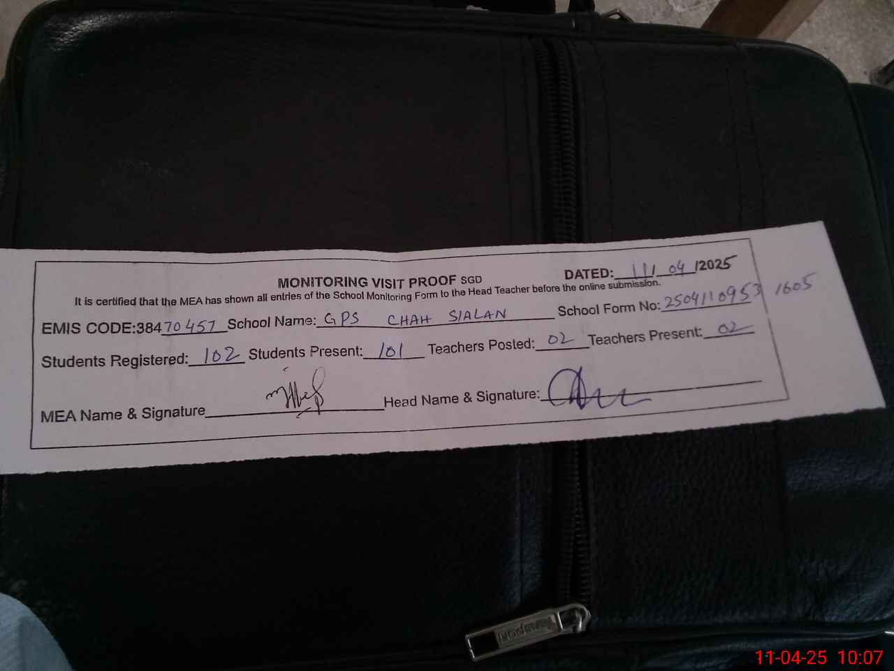 | Attendance Register | Head Teacher | MEA with School | Visit Proof |