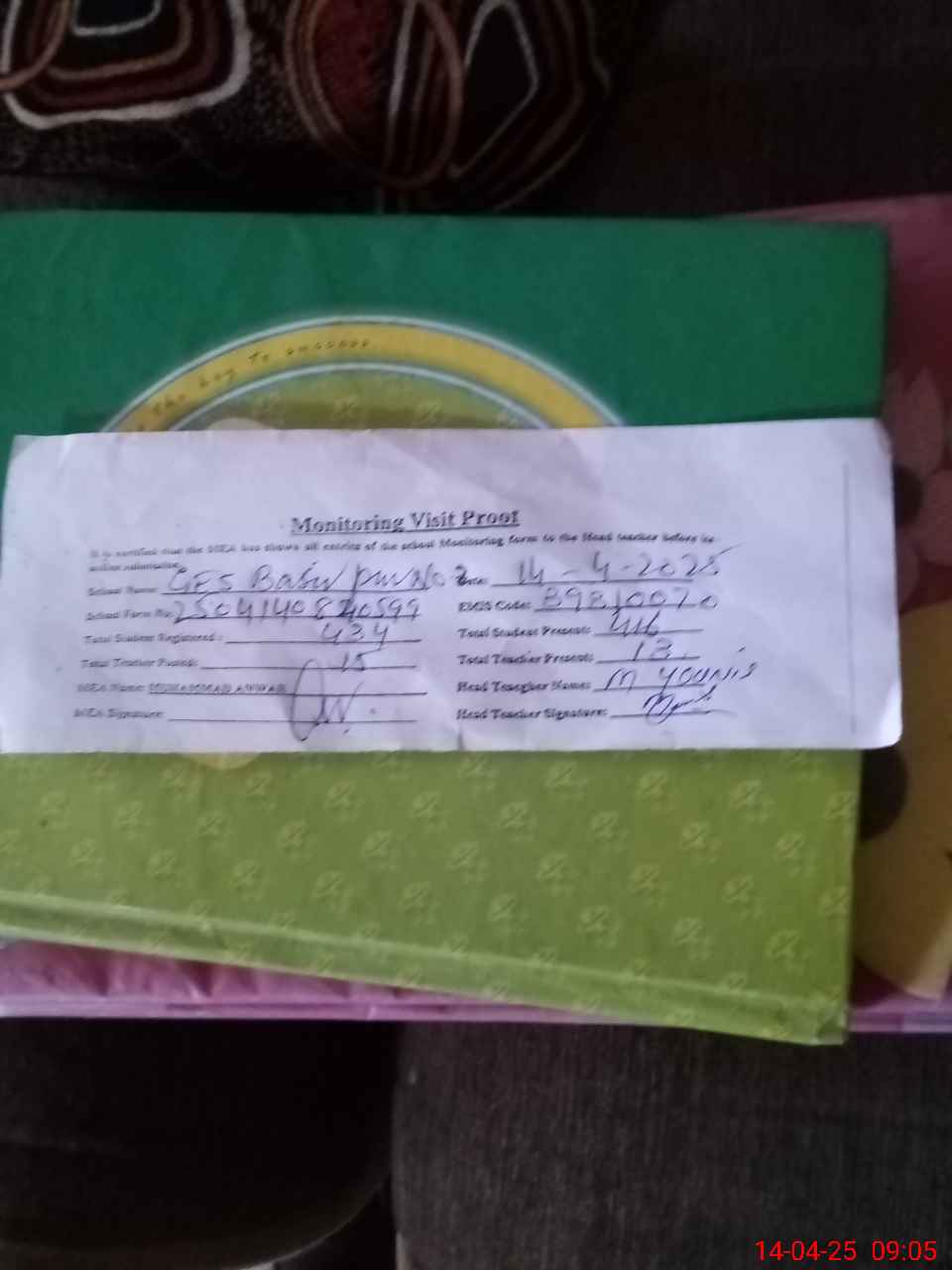 | Attendance Register | Head Teacher | MEA with School | Visit Proof |
