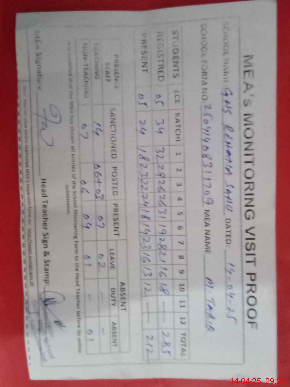 | Attendance Register | Head Teacher | MEA with School | Visit Proof |