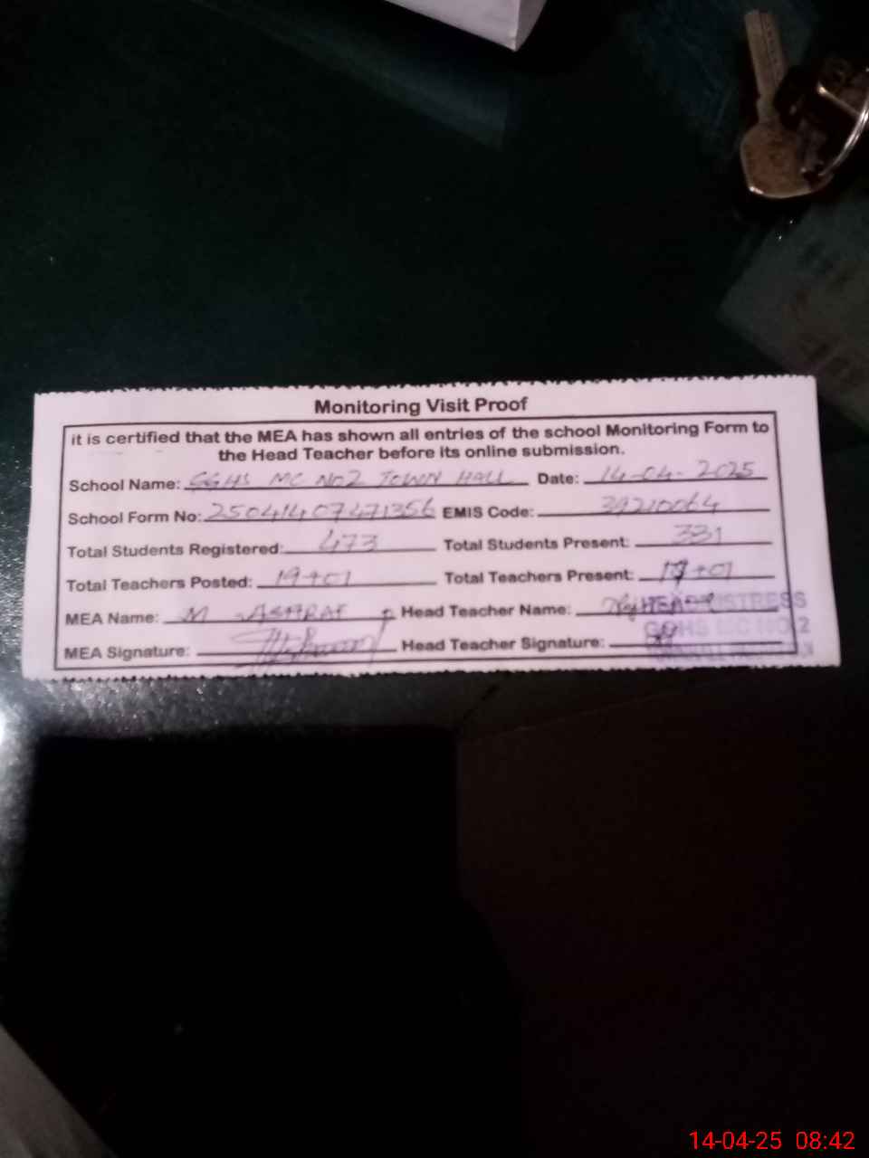| Attendance Register | Head Teacher | MEA with School | Visit Proof |