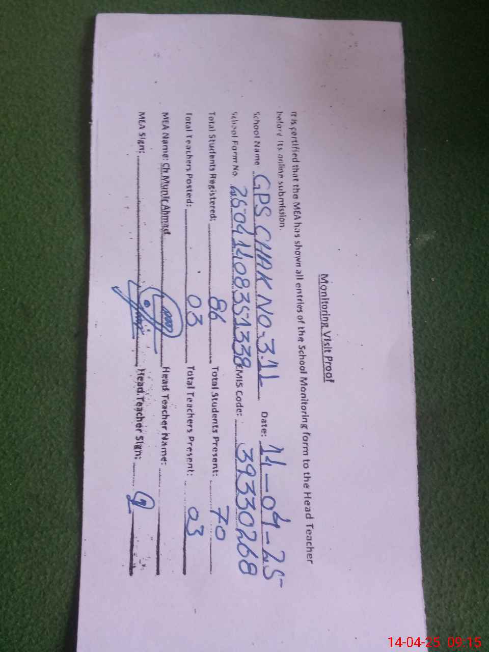 | Attendance Register | Head Teacher | MEA with School | Visit Proof |
