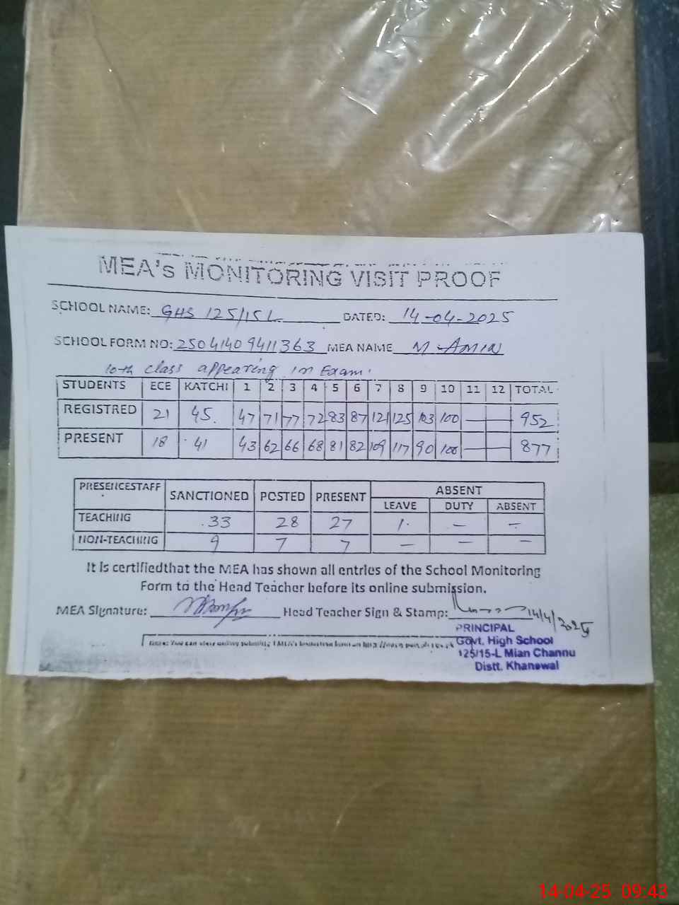 | EMIS Code: 36430019 | Name of School: GHS 125/15-L, MIAN CHANNU | |||