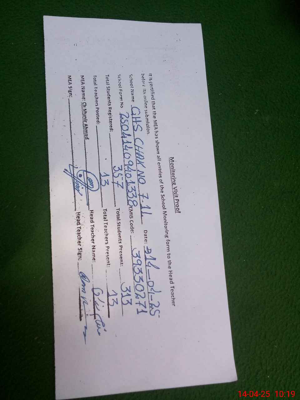 | Attendance Register | Head Teacher | MEA with School | Visit Proof |