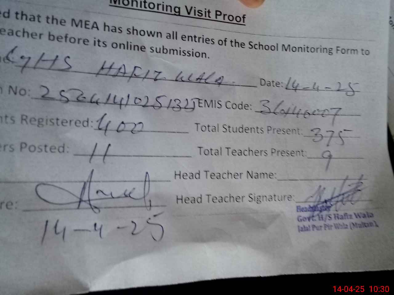| EMIS Code: 36140007 | Name of School: GHS HAFIZ WALA JALALPUR PIRWALA | |||