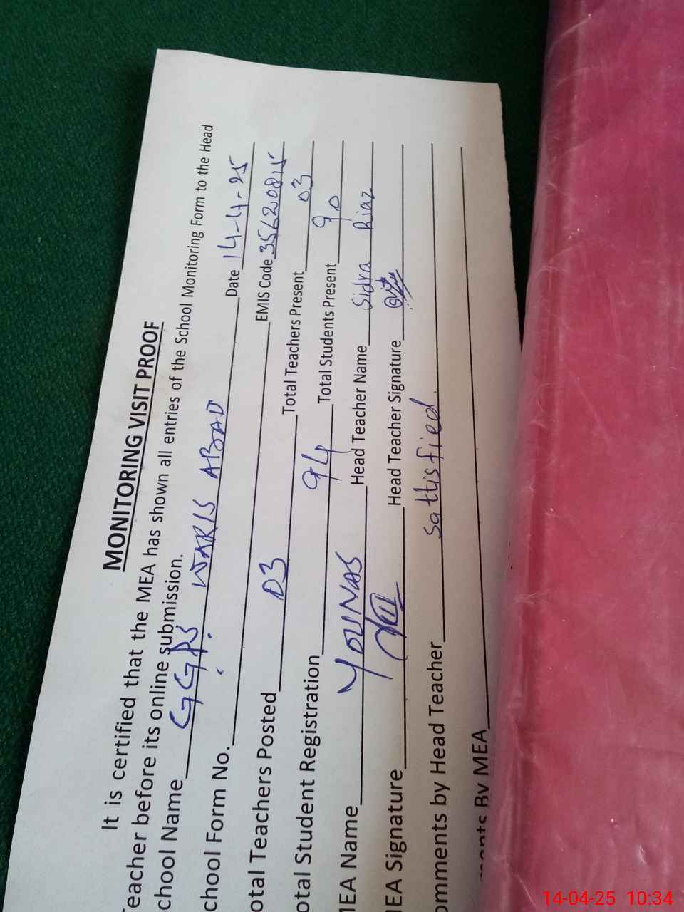 | Attendance Register | Head Teacher | MEA with School | Visit Proof |