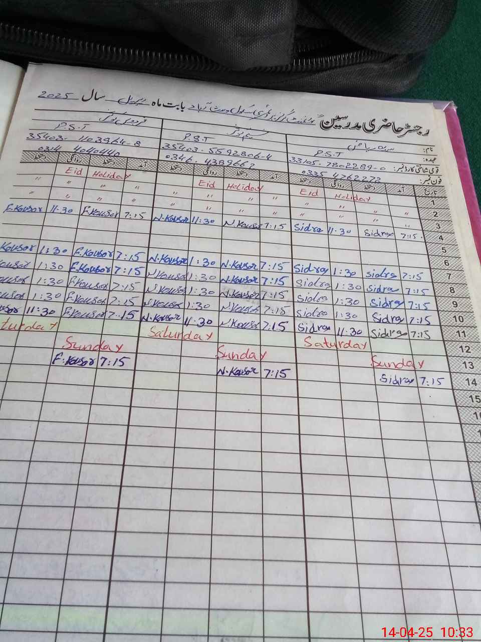 | CNIC | Full Name | Designation | R/C | Absence During Last Calender Month |