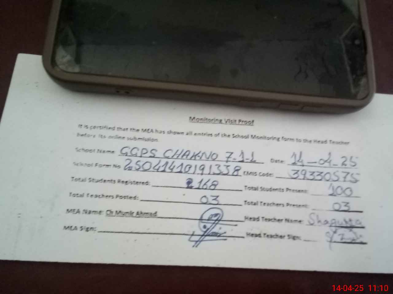 | Attendance Register | Head Teacher | MEA with School | Visit Proof |