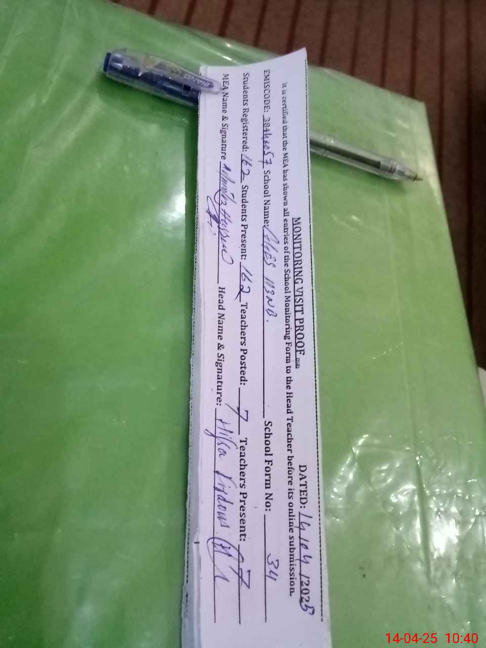 | Attendance Register | Head Teacher | MEA with School | Visit Proof |
