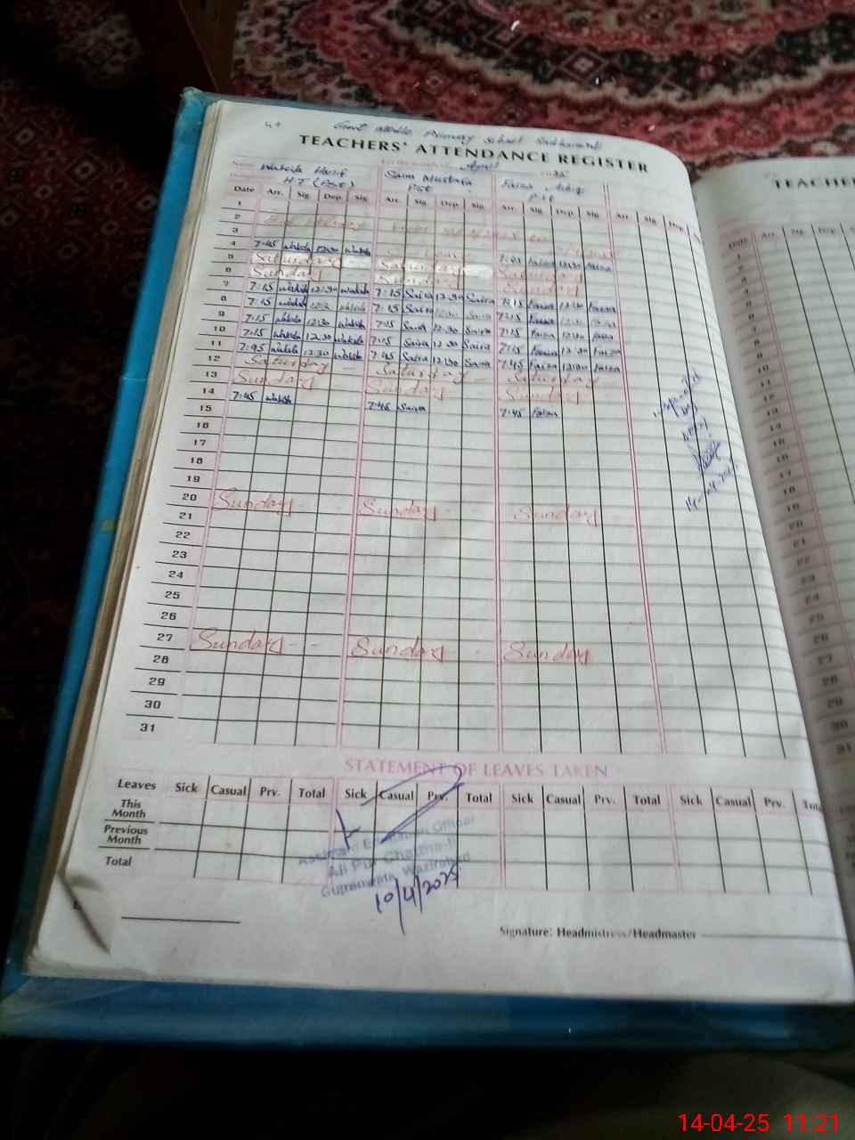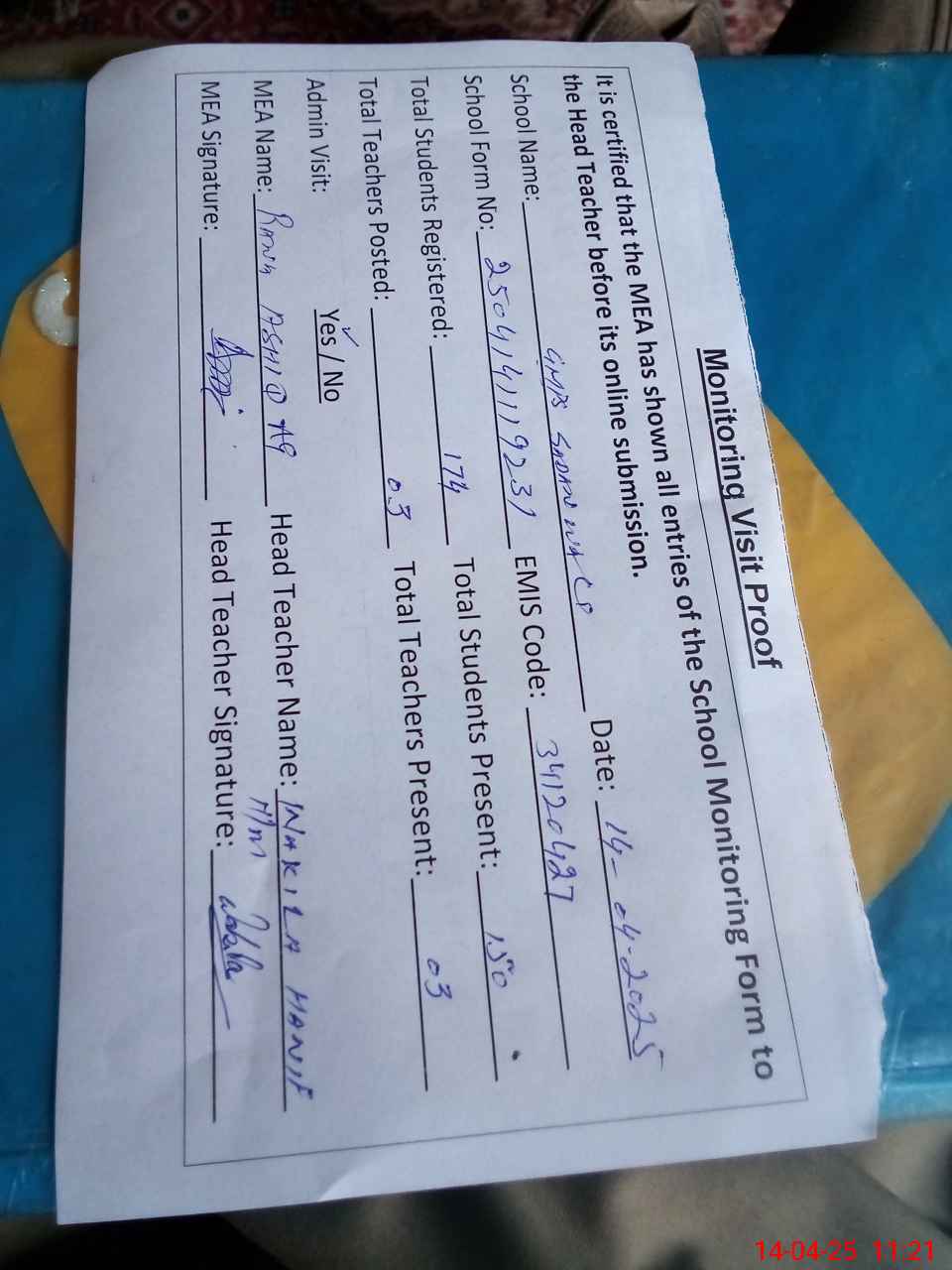 | Attendance Register | Head Teacher | MEA with School | Visit Proof |