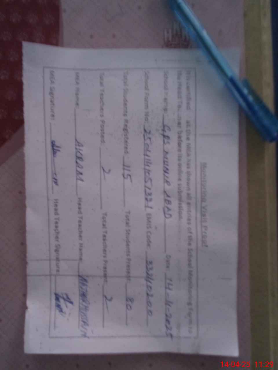 | Attendance Register | Head Teacher | MEA with School | Visit Proof |