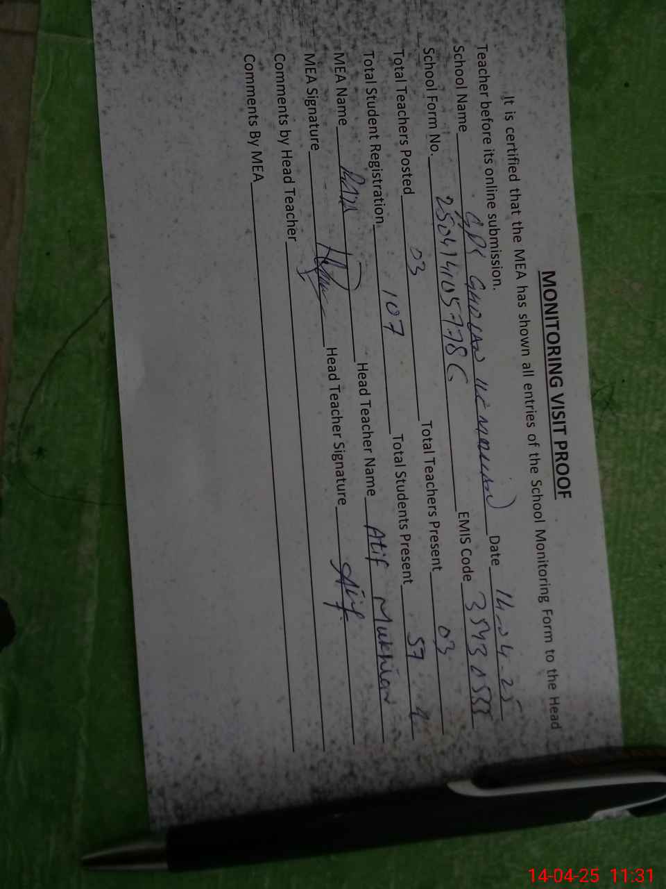| Attendance Register | Head Teacher | MEA with School | Visit Proof |