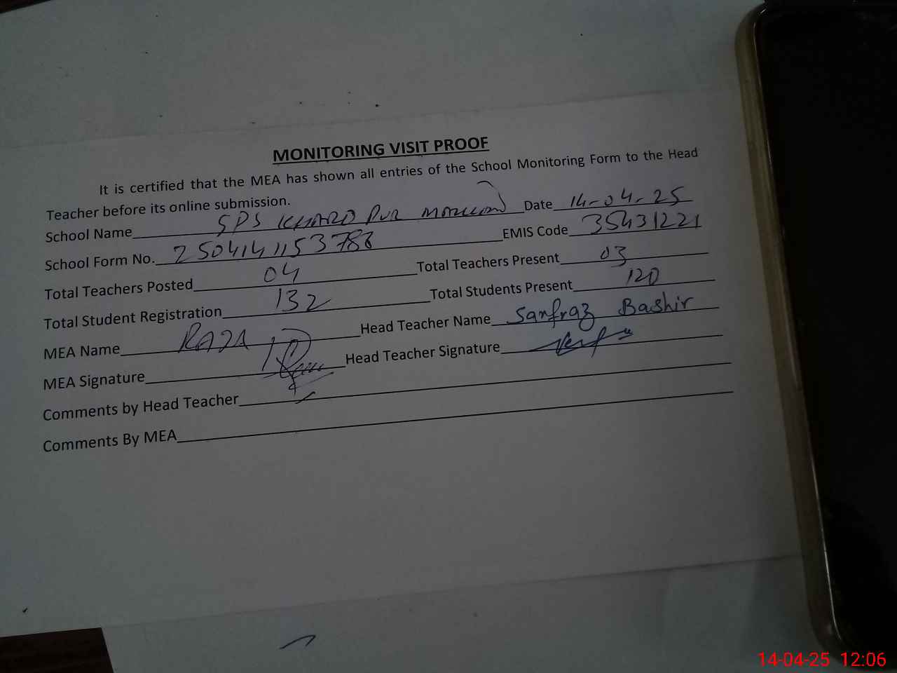 | Attendance Register | Head Teacher | MEA with School | Visit Proof |