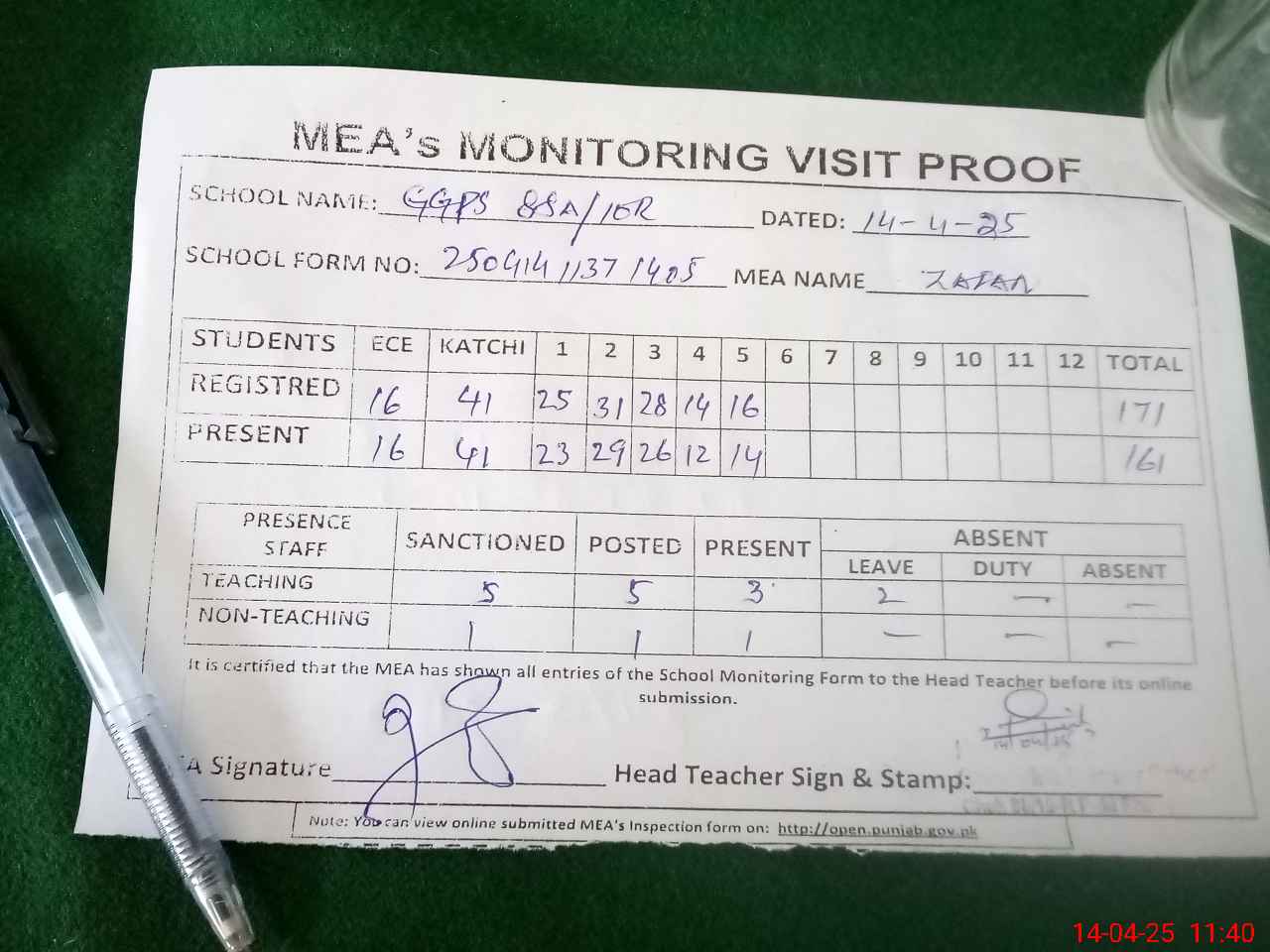 | Attendance Register | Head Teacher | MEA with School | Visit Proof |