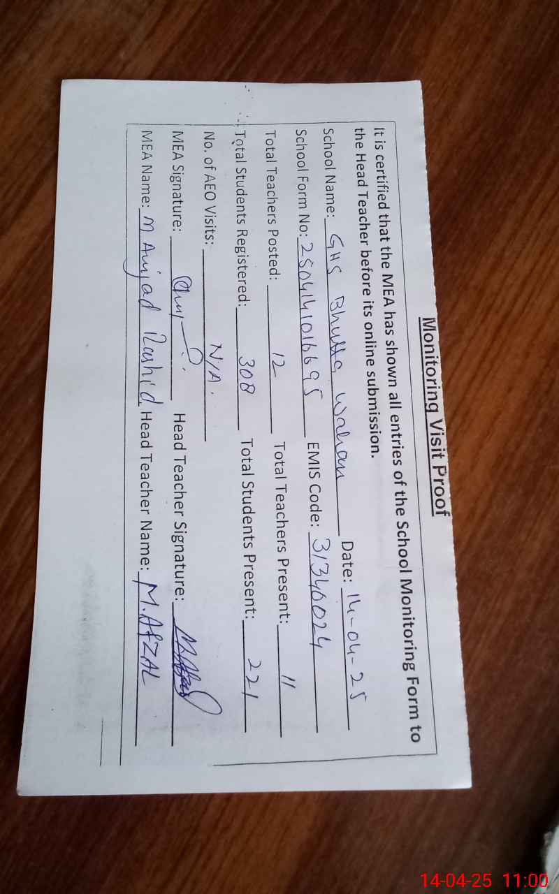 | EMIS Code: 31340024 | Name of School: GHS BHUTTA WAHAN | |||