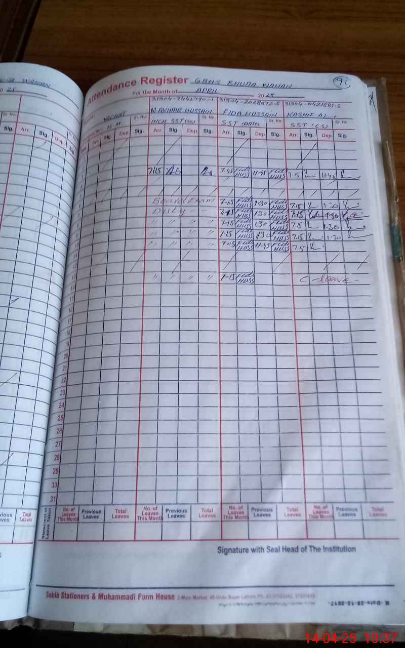 | 31**** | Mu**** Ak**** Hu**** | SST | Regular | 0 | 0 | 0 | 0 | 0 | 0 | 0 | 0 | 0 | Exam Duty |