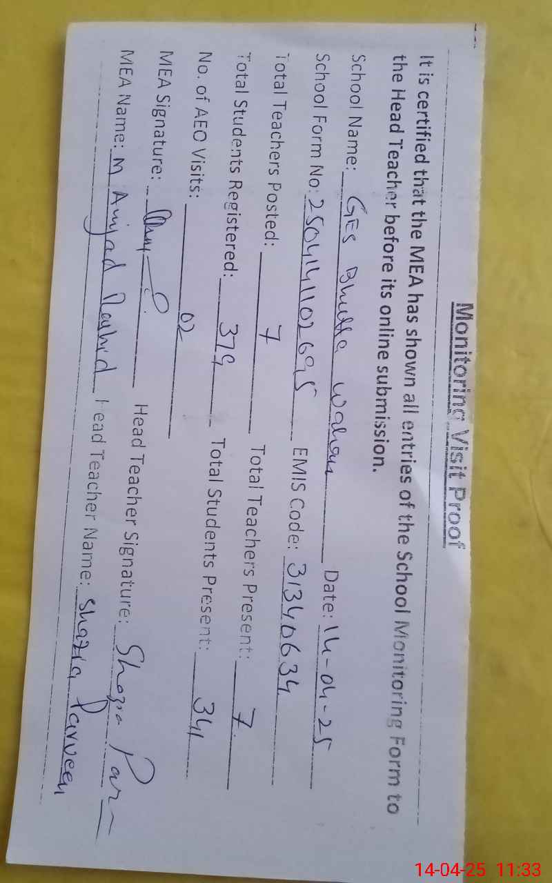 | EMIS Code: 31340634 | Name of School: GGES BHUTTA WAHAN | |||