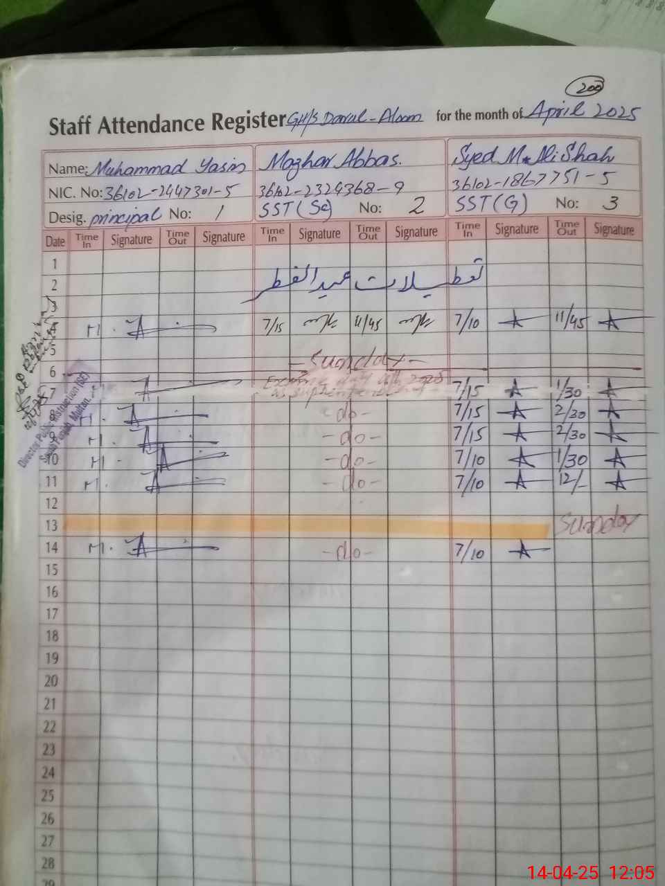 | CNIC | Full Name | Designation | R/C | Absence During Last Calender Month |