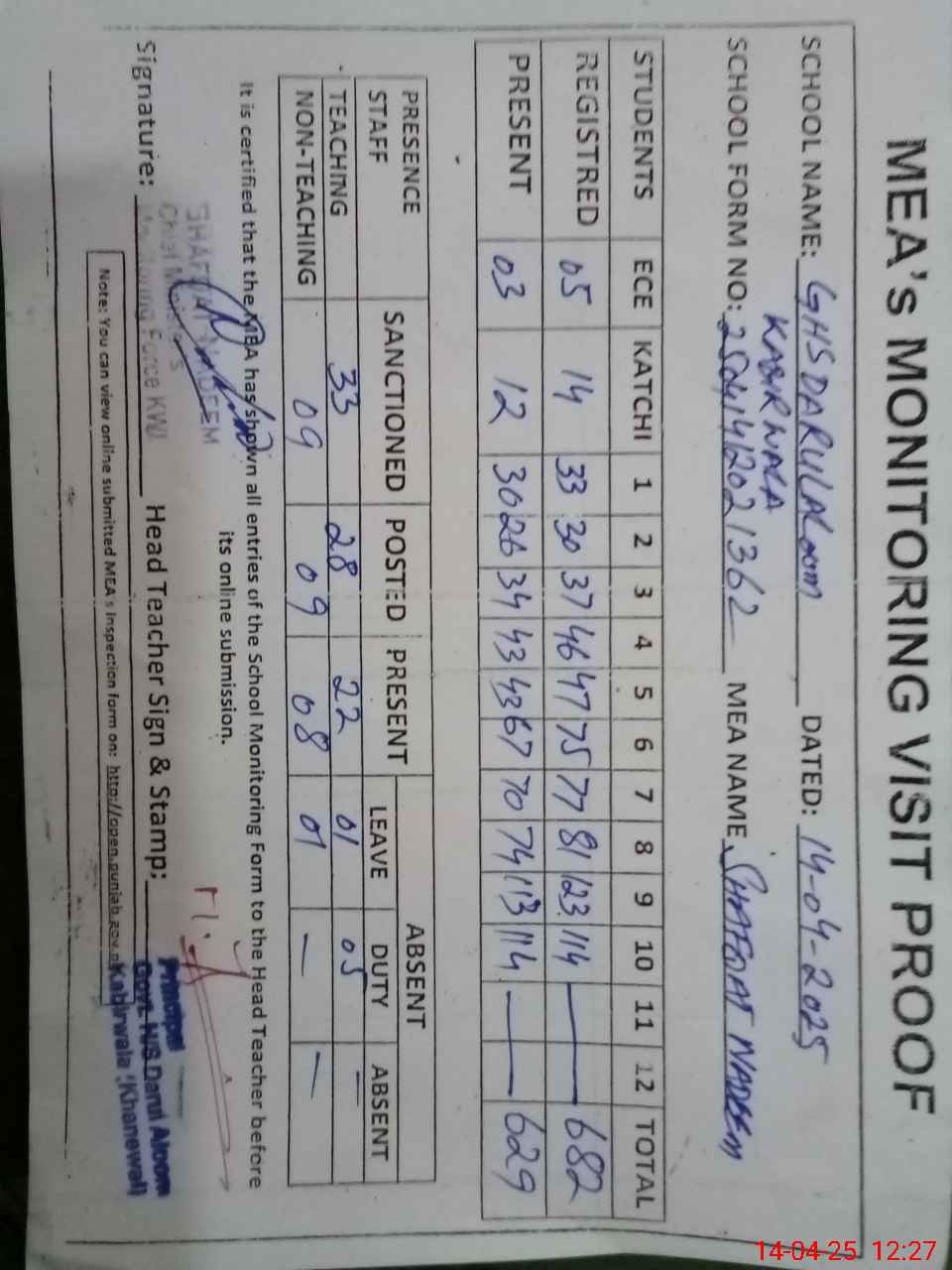 | Attendance Register | Head Teacher | MEA with School | Visit Proof |