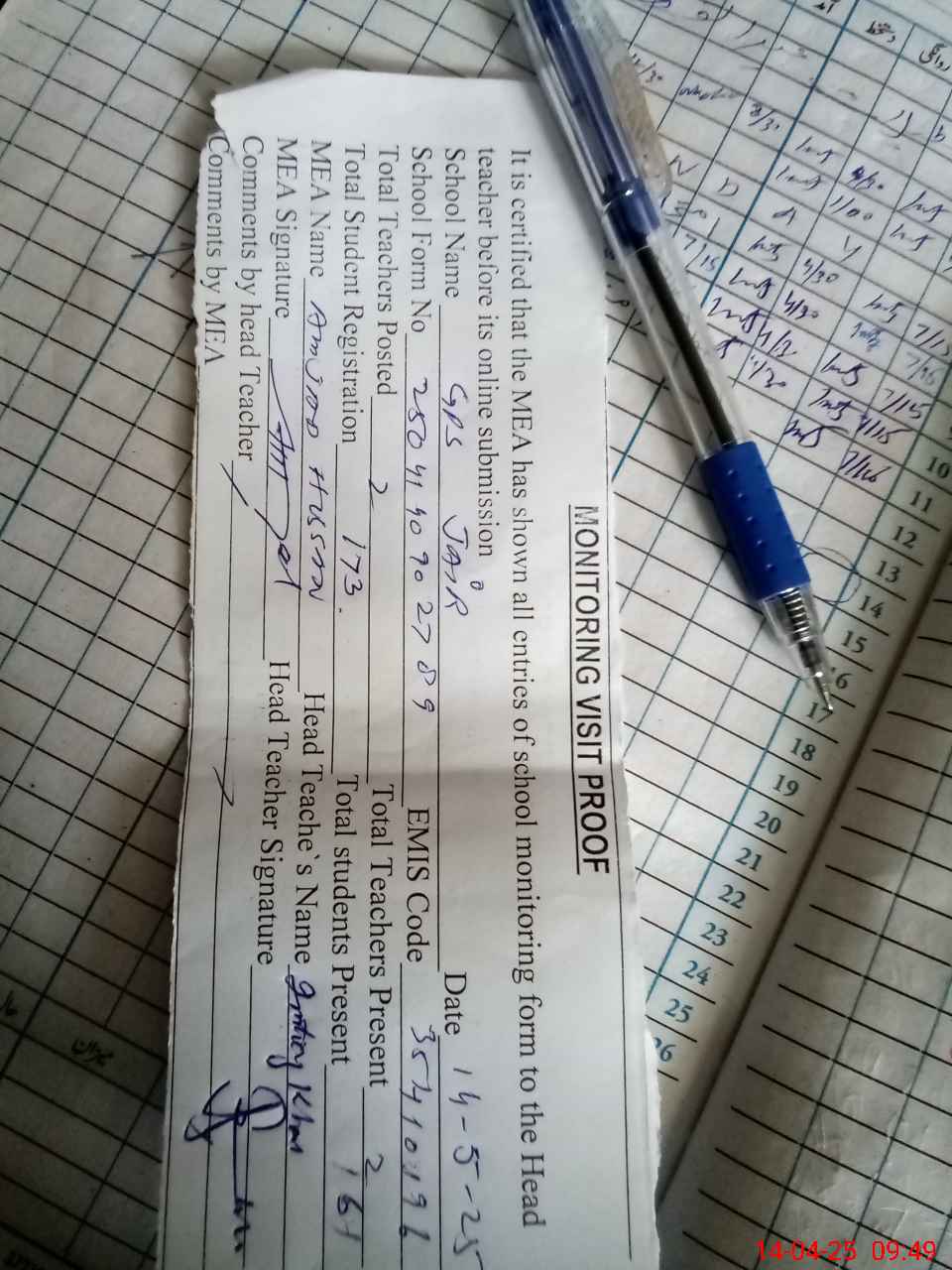 | Attendance Register | Head Teacher | MEA with School | Visit Proof |