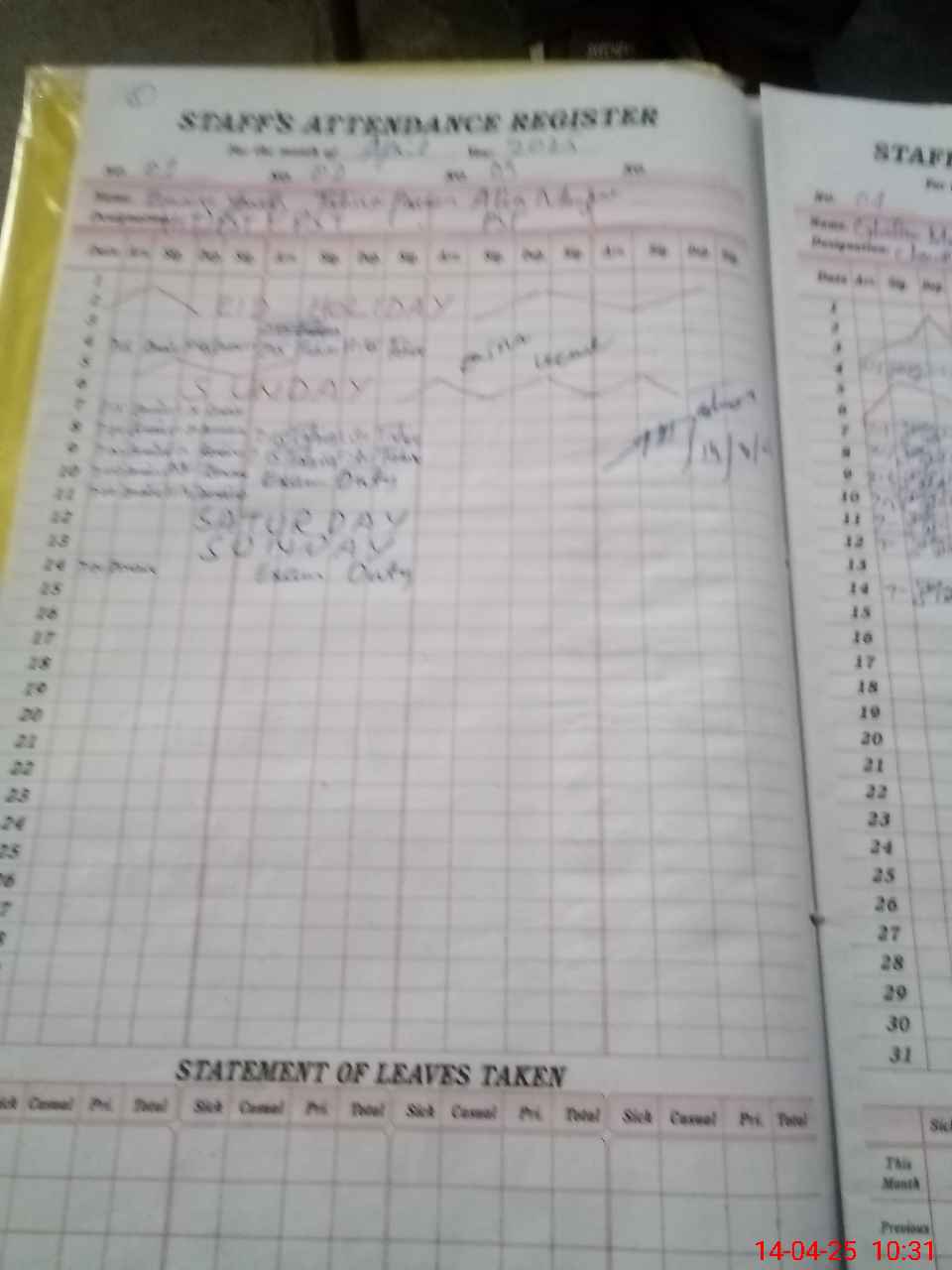 | 35**** | Ta**** Pa**** | PST | Regular | 0 | 0 | 0 | 0 | 0 | 0 | 0 | 0 | 0 | Exam Duty |