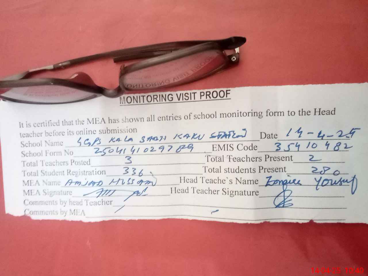| Attendance Register | Head Teacher | MEA with School | Visit Proof |