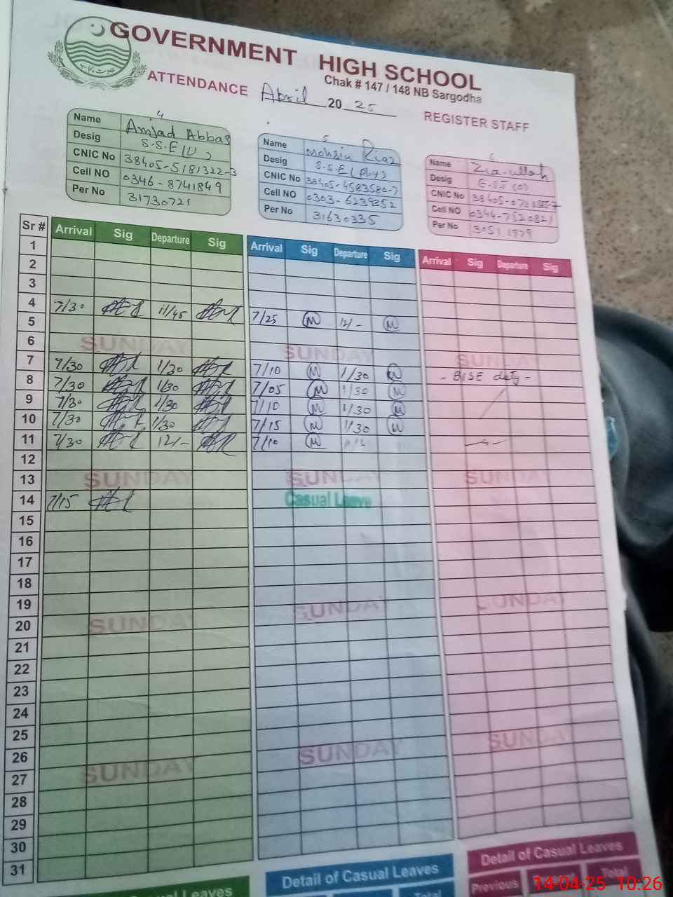 | CNIC | Full Name | Designation | R/C | Absence During Last Calender Month |