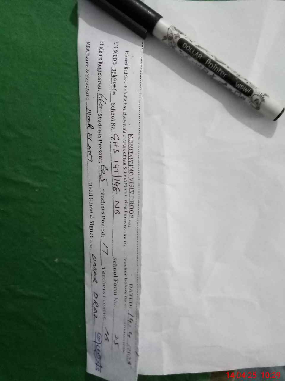 | Attendance Register | Head Teacher | MEA with School | Visit Proof |