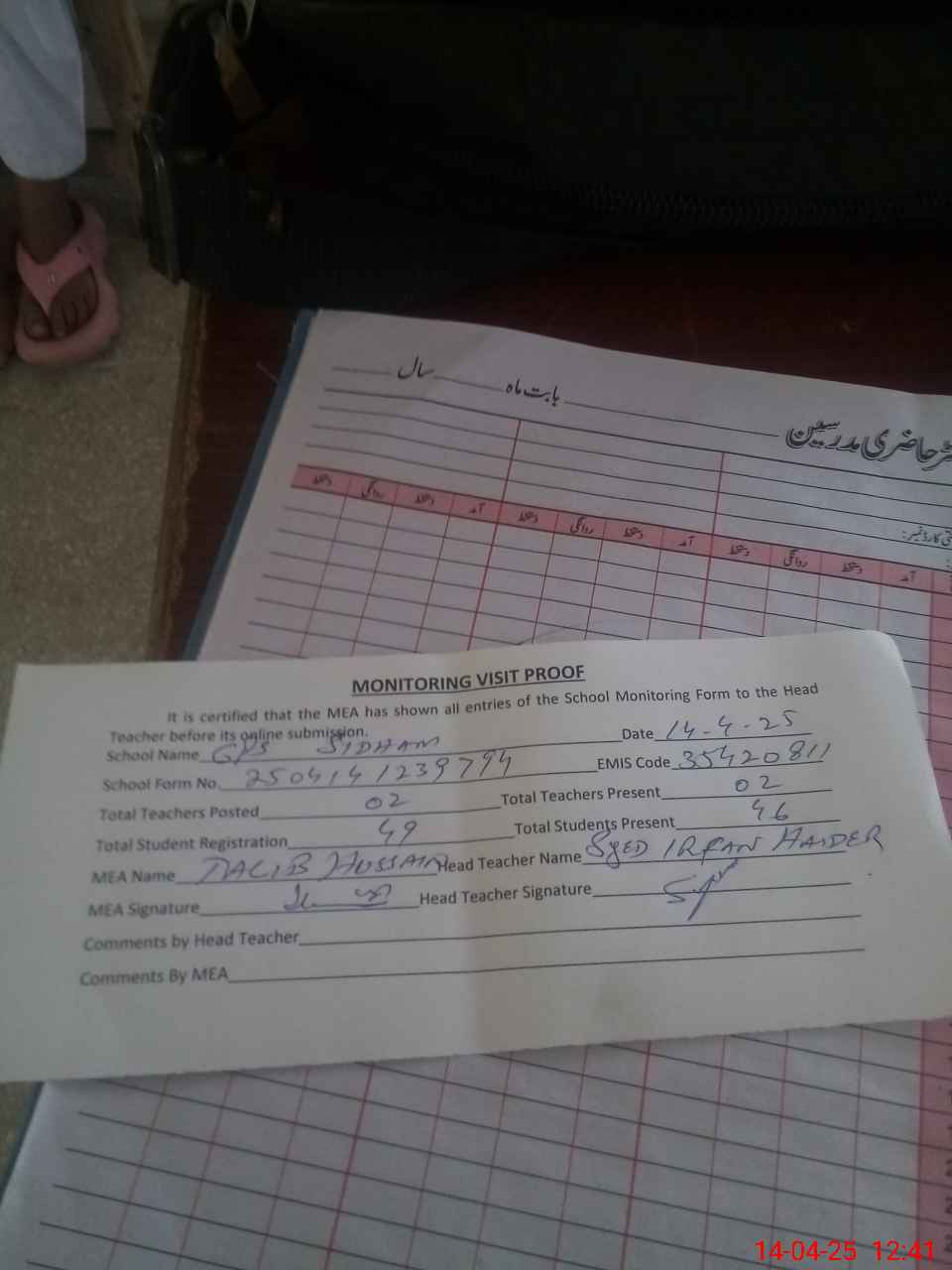 | Attendance Register | Head Teacher | MEA with School | Visit Proof |