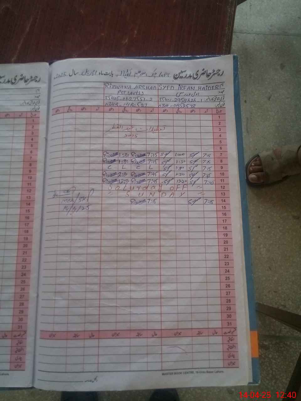 | CNIC | Full Name | Designation | R/C | Absence During Last Calender Month |