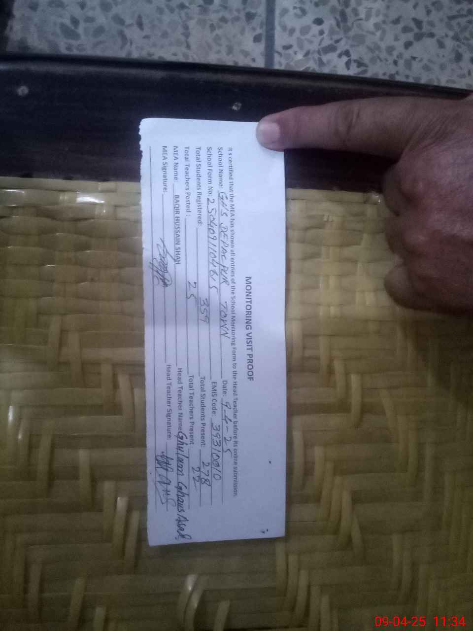 | Attendance Register | Head Teacher | MEA with School | Visit Proof |