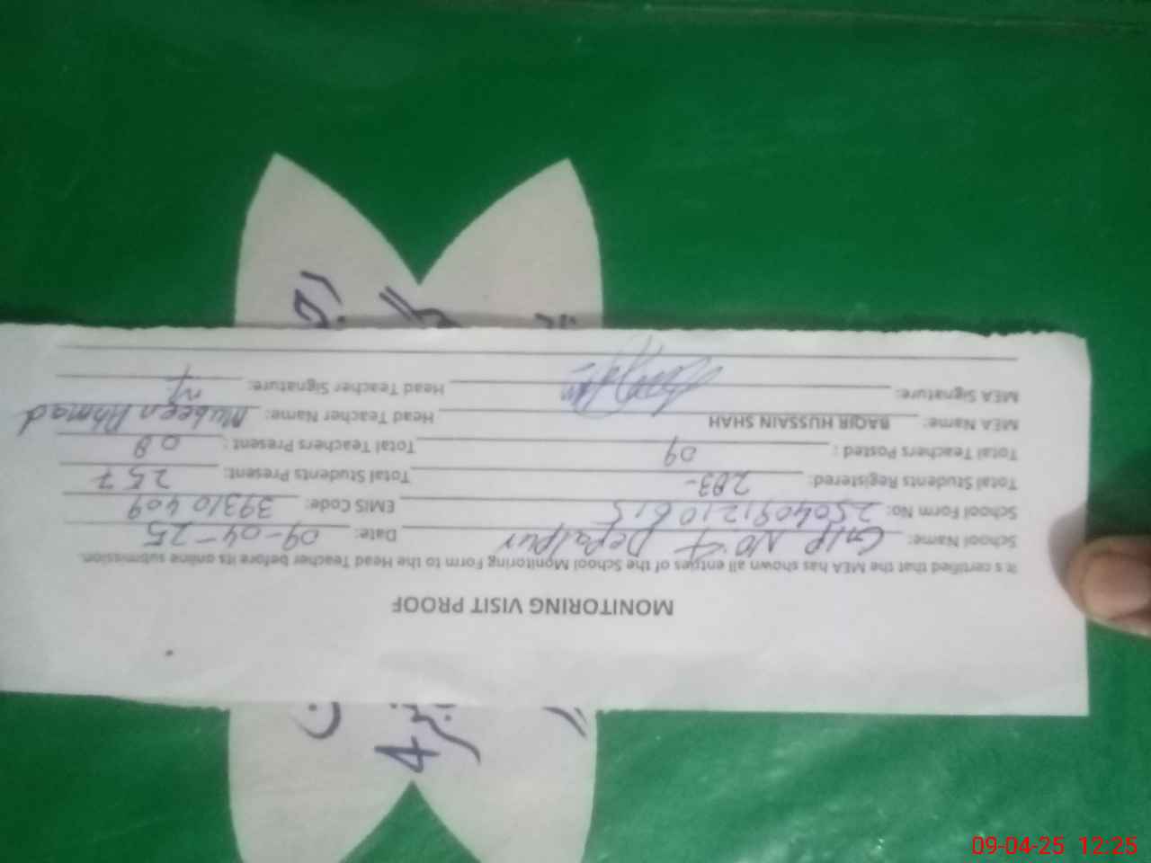 | Attendance Register | Head Teacher | MEA with School | Visit Proof |