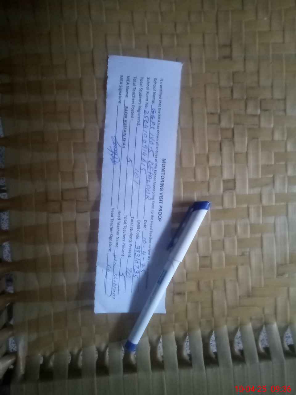 | Attendance Register | Head Teacher | MEA with School | Visit Proof |