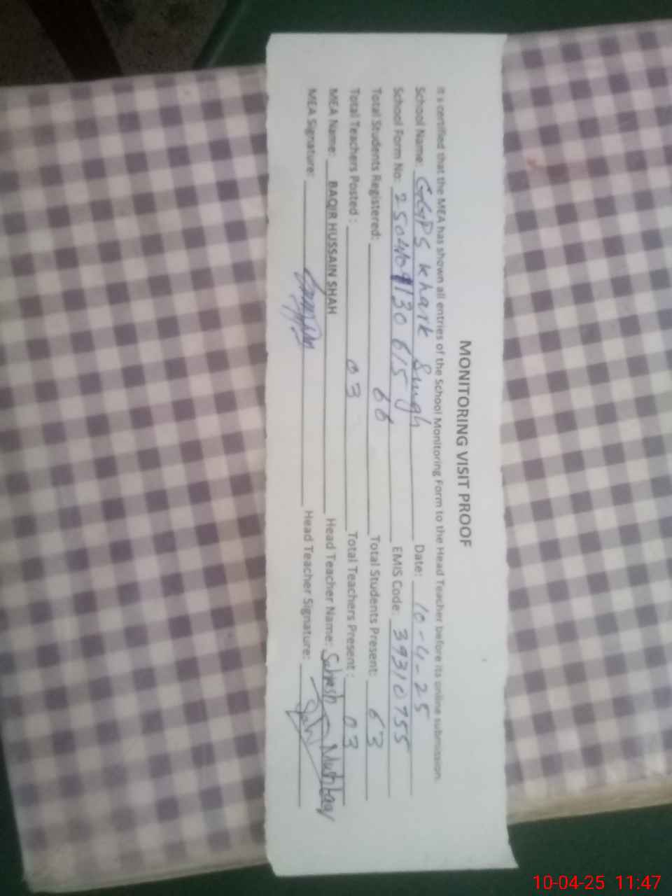 | Attendance Register | Head Teacher | MEA with School | Visit Proof |