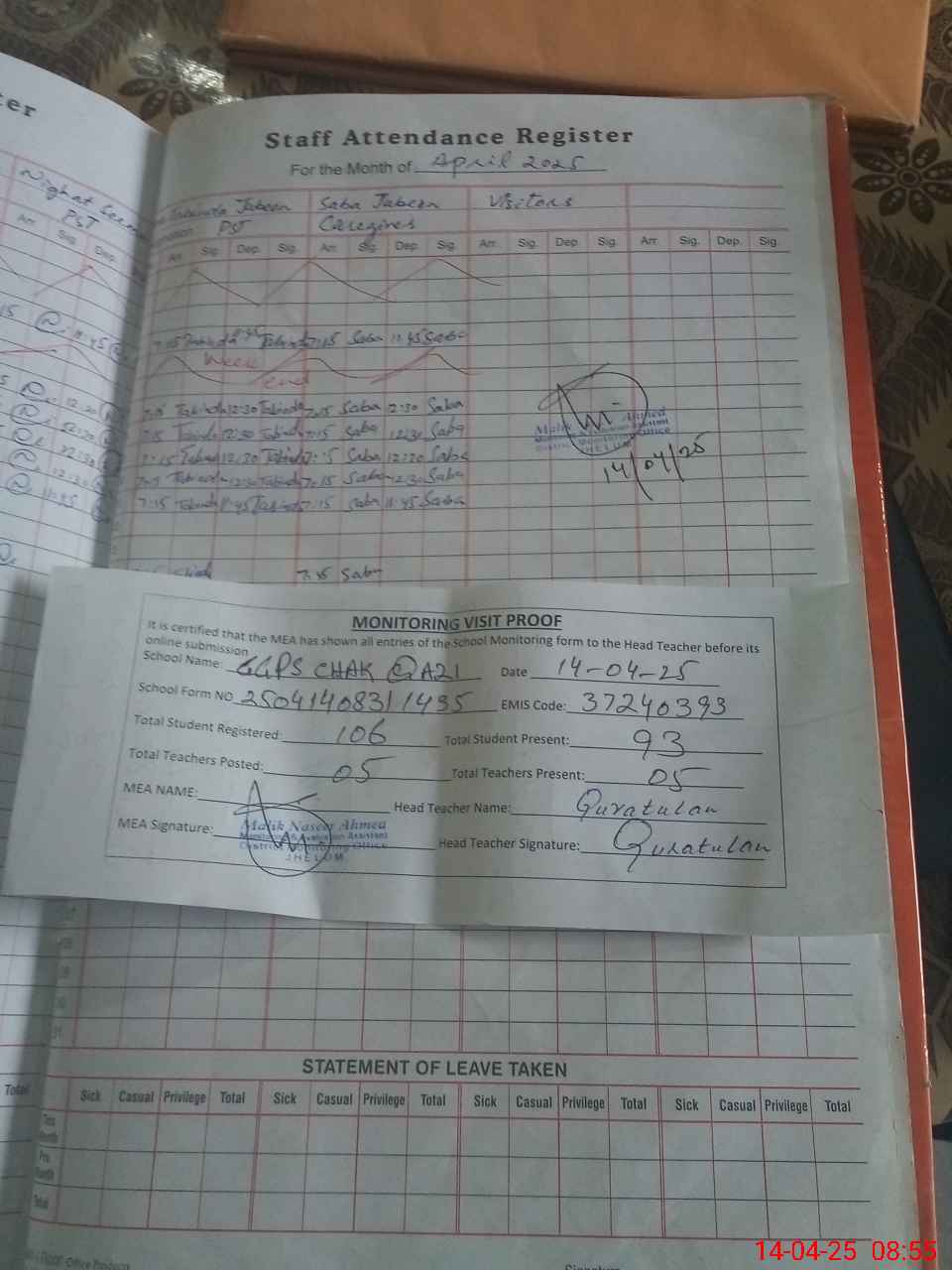 | Attendance Register | Head Teacher | MEA with School | Visit Proof |