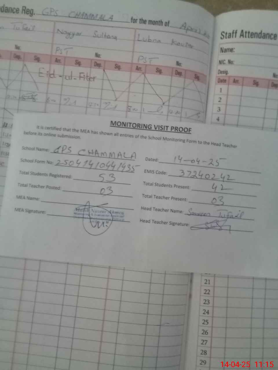 | Attendance Register | Head Teacher | MEA with School | Visit Proof |