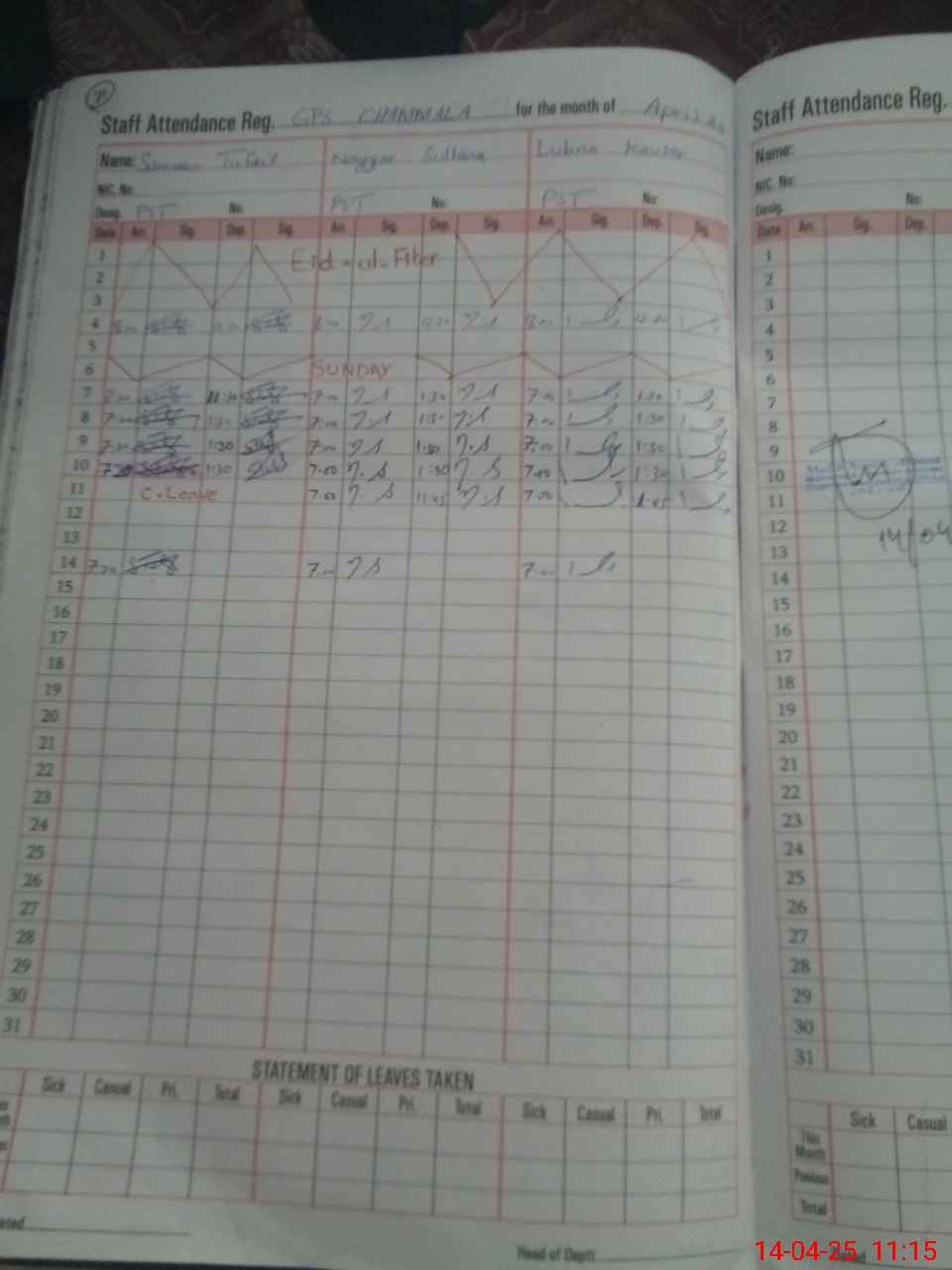 | CNIC | Full Name | Designation | R/C | Absence During Last Calender Month |
