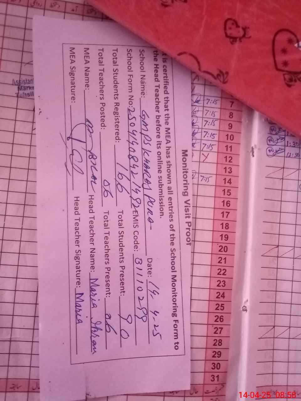 | Attendance Register | Head Teacher | MEA with School | Visit Proof |