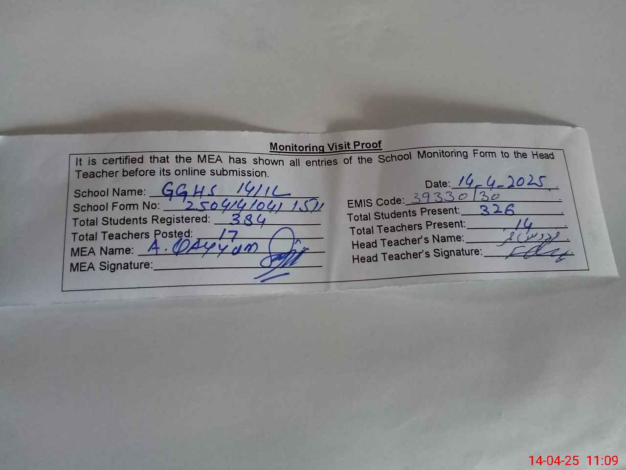 | EMIS Code: 39330130 | Name of School: GGHS CHAK NO. 14/1-L | |||