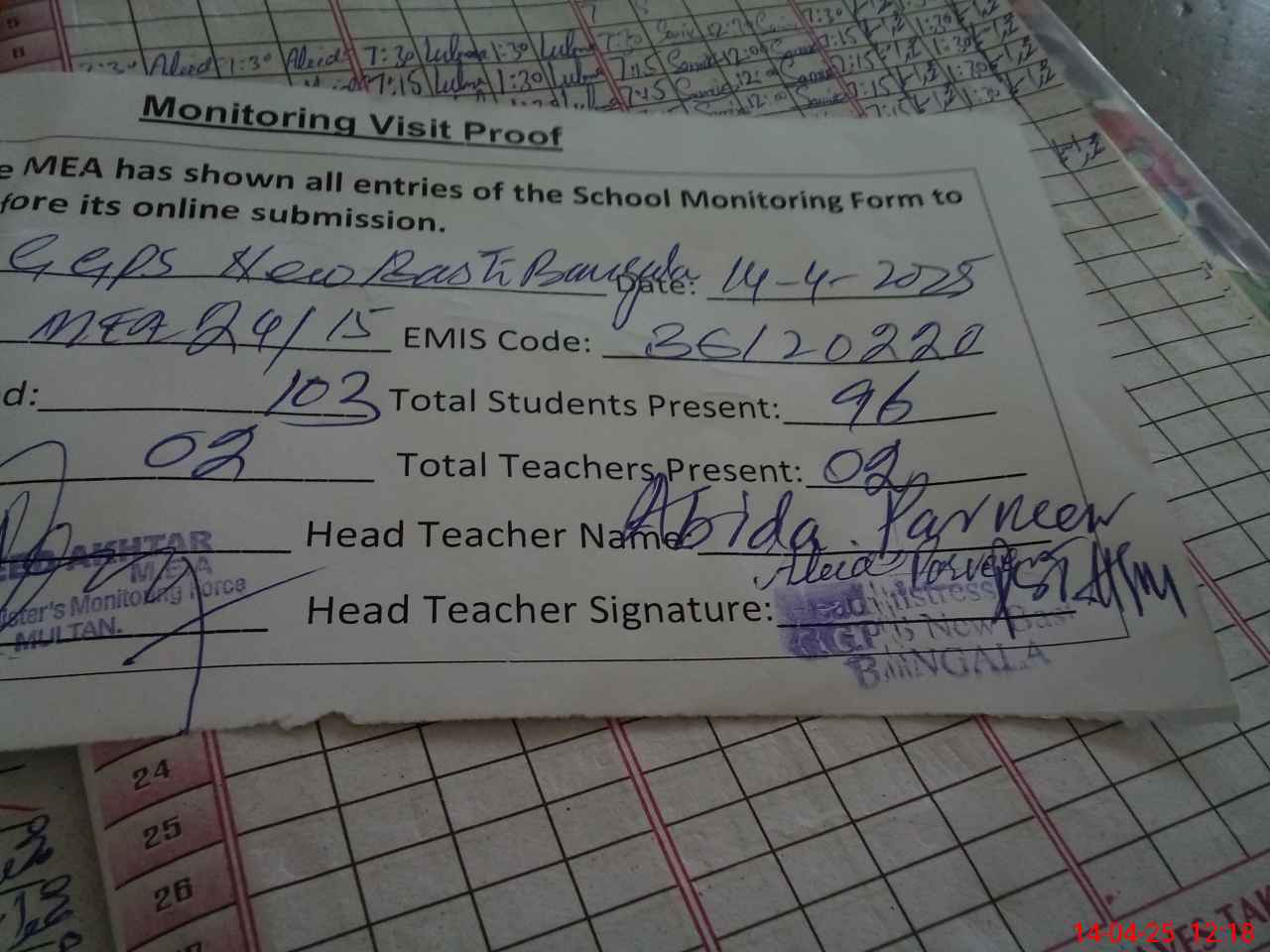 | Attendance Register | Head Teacher | MEA with School | Visit Proof |