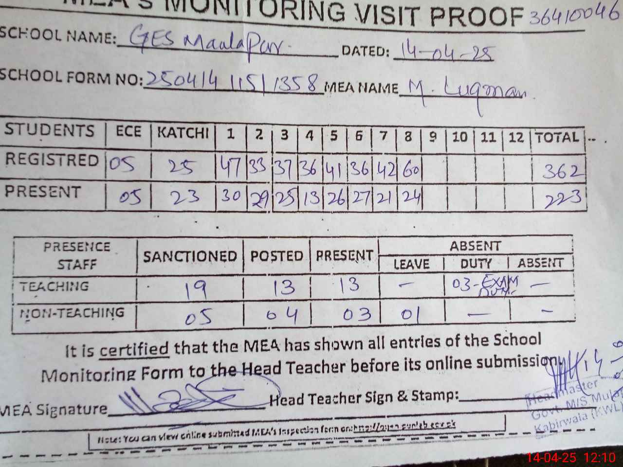| EMIS Code: 36410046 | Name of School: GES MOULA PUR KABIRWALA | |||