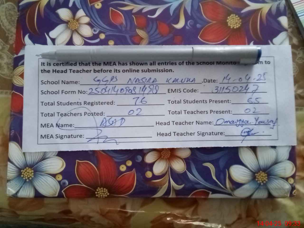 | Attendance Register | Head Teacher | MEA with School | Visit Proof |